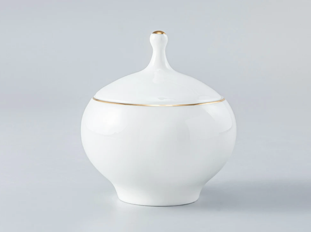 Сахарница рис. Золотой кант изготовлена на Императорском фарфоровом заводе из костяного фарфора с отводкой золотом вручную. Автор формы - Линчевская Т.С.